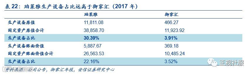根据2017年年报,珀莱雅固定资产中生产设备占比远高于御家汇;公司更为重视生产设备投资,可判断公司对产品需求变化等不确定因素具备更强应变能力。