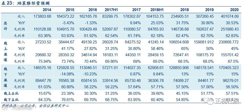 假设2018-2020年,珀莱雅线上销售保持高速增长、增速依次为65%/50%/45%,线下渠道持续优化且单品牌店贡献增量收入、增速依次为13%/15%/15%,则珀莱雅2018-2020年总收入增速约为32%/31%/31%。