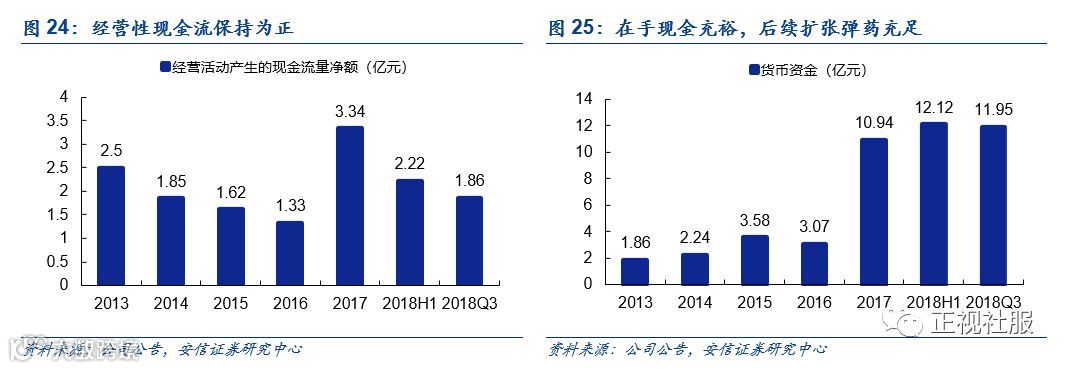 2013年起,公司经营性现金流保持为正;截止2018Q3,货币资金为11.95亿元,在手现金充裕。公司现金流健康且弹药充足,充分保障后续扩张。