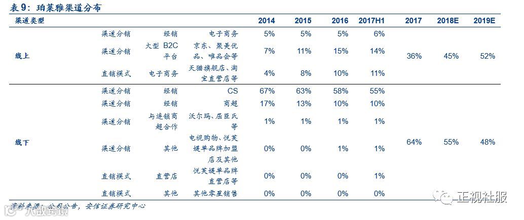 ■线下增量:精准卡位低线城市,现有渠道效率提升+单品牌店助力成长。①销售网络深入低线城市,在低线城市品牌深入人心,有望通过提升效率、优化网点保持增速。截止2017H1,公司已经构建了遍及国内30多个城市的全渠道分销网络,覆盖销售终端约1.9万家CS门店、2803家商城超市、以及206家连锁商超。根据CBO,珀莱雅品牌在调研的省份(广东、甘肃、青海、宁夏、山西、山东)中销量均位于前列。坚定布局单品牌店,有望加速开拓低线城市广阔空间。②单品牌店对低线城市有极强适应性,珀莱雅从2016年起坚定布局单品牌店,有望通过单品牌店深入低线、提升份额。截止2017年底,公司已有悦芙媞单品牌店31家、优资莱单品牌店开店126家;2018年公司继续快速布局优资莱单品牌店、并尝试拓展珀莱雅单品牌店。到2018年11月,优资莱签约门店破1000家。
