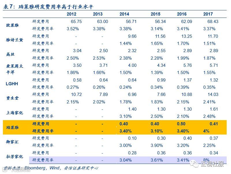 公司研发费用占营业收入比重在行业内处于领先地位,并且持续提高公司在研发领域的竞争力。研发体系一直伴随业务的拓展而快速发展完善,技术研发始终处于核心地位。2015—2017年公司研发费用分别为3505万元、4746万元、4083万元,占比营业收入比例为3.18%、4.57%、3.50%。当珀莱雅与世界知名品牌在全球市场、国内市场正面交锋的时候,产品科技含量可以弥补品牌弱势带来的短板。