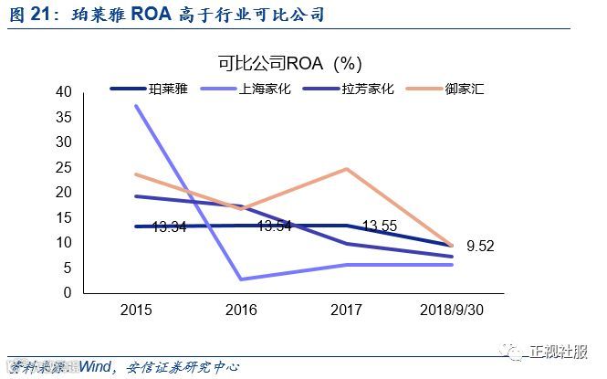 珀莱雅上市后,ROA略有下降,但2018Q3,珀莱雅ROA远高于上海家化、拉芳家化;略高于御家汇。