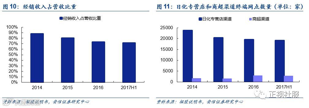 起家于CS,销售渠道不断丰富。珀莱雅品牌起家于CS渠道,虽然随着销售渠道的逐渐丰富,CS渠道占比逐渐下滑,但2017H1CS渠道仍贡献了公司销售额的55%。截止2017H1,公司已经构建了遍及国内30多个城市的全渠道分销网络,覆盖销售终端约1.9万家CS门店、2803家商城超市、以及206家连锁商超。