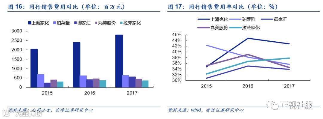 2015-2017年公司销售费用分别为6.96亿元、6.19亿元和6.35亿元,销售费用率分别为42.33%、38.19%、35.66%。品牌形象和营销宣传是公司业务取得成功的关键因素,通过丰富有效的市场营销和广告宣传迅速提高品牌知名度和市场占有率。
