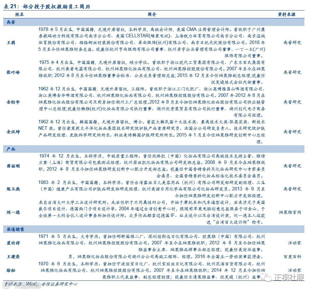 管理层具备化妆品相关专业知识储备,拥有丰富的化妆品行业从业经验。董事长侯军呈先生、总经理方玉友先生均在清华大学化妆品行业总裁高级研修班结业。创始人侯军呈先生90年代就开始代理化妆品运营,相继获得了小护士、羽西、大宝、兰贵人等著名化妆品品牌的代理经销权,营业额做到了义乌前三。2003年创立珀莱雅品牌创立,走民族化妆品牌之路。带领珀莱雅于2003-2007进行第一次创业阶段,坚持品质第一+农村包围城市的战略。2008-2012年进入二次创业阶段,坚持营销为王,品牌宣导。