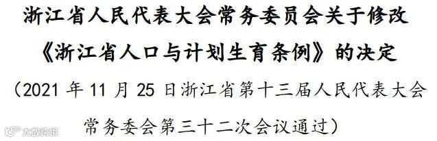 《浙江省人民代表大会常务委员会关于修改〈浙江省人口与计划生育条例〉的决定》已于2021年11月25日经浙江省第十三届人民代表大会常务委员会第三十二次会议通过,现予公布,自公布之日起施行。