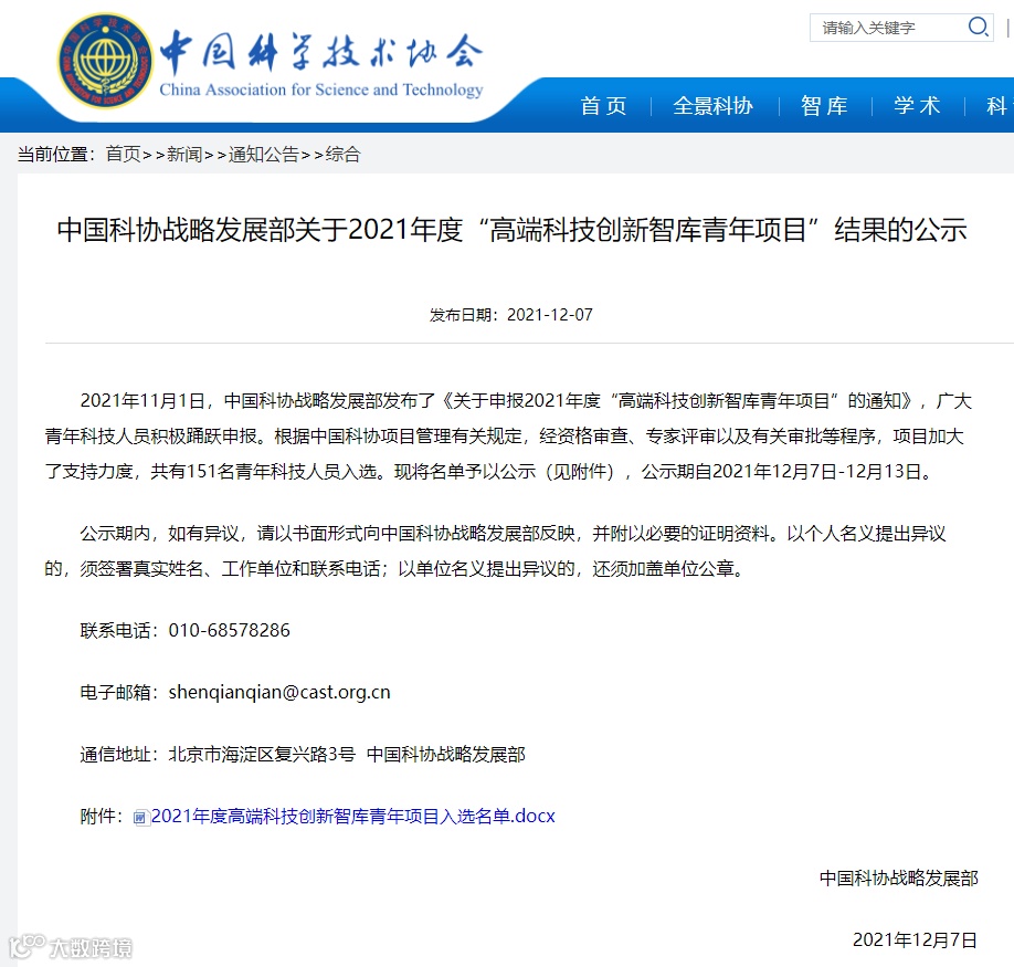 12月7日,中国科协战略发展部公示2021年度“高端科技创新智库青年项目”结果。共有151名青年科技人员入选,其中包括52所高校的117名青年科技人员。