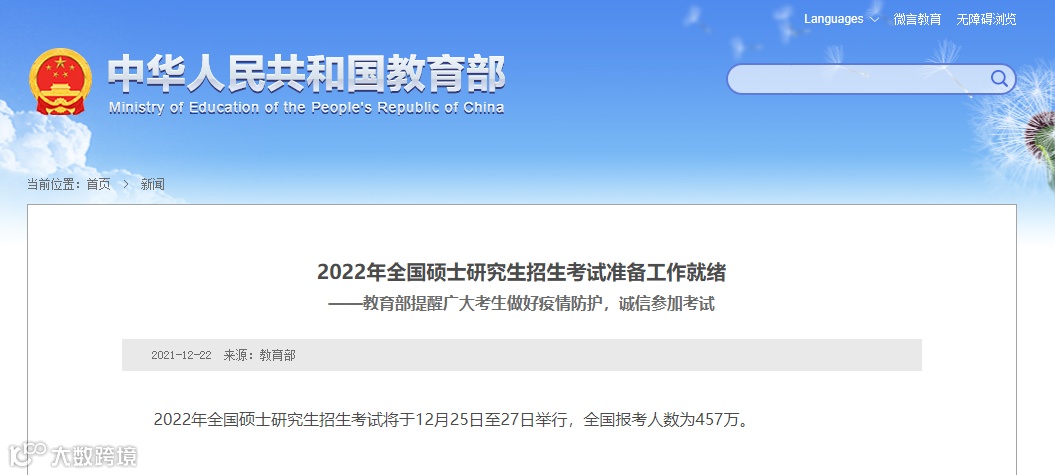 12月22日,教育部发布最新提醒:2022年全国硕士研究生招生考试将于12月25日至27日举行,全国报考人数为457万。2022年全国硕士研究生招生考试准备工作就绪,教育部提醒广大考生做好疫情防护,诚信参加考试。
