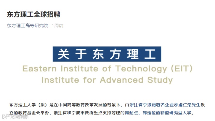 近日,东方理工高等研究院发布一则全球招聘公告,透露出了备受关注的新大学——东方理工大学(拟)的最新建设情况。其中,有一信息引人注目:东方理工大学(拟)是由浙江省宁波籍著名企业家虞仁荣先生设立的教育基金会举办、浙江省和宁波市政府重点支持筹建的高起点、高定位的新型研究型大学。