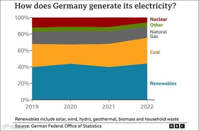 淘汰核能、使用可再生能源一直是德国政府的能源方针,但受俄乌冲突影响,德国煤炭和液化天然气的使用率不断上升,可再生能源的比例却停滞不前。这一现实使得德国内部产生了是否应续用核电的讨论。