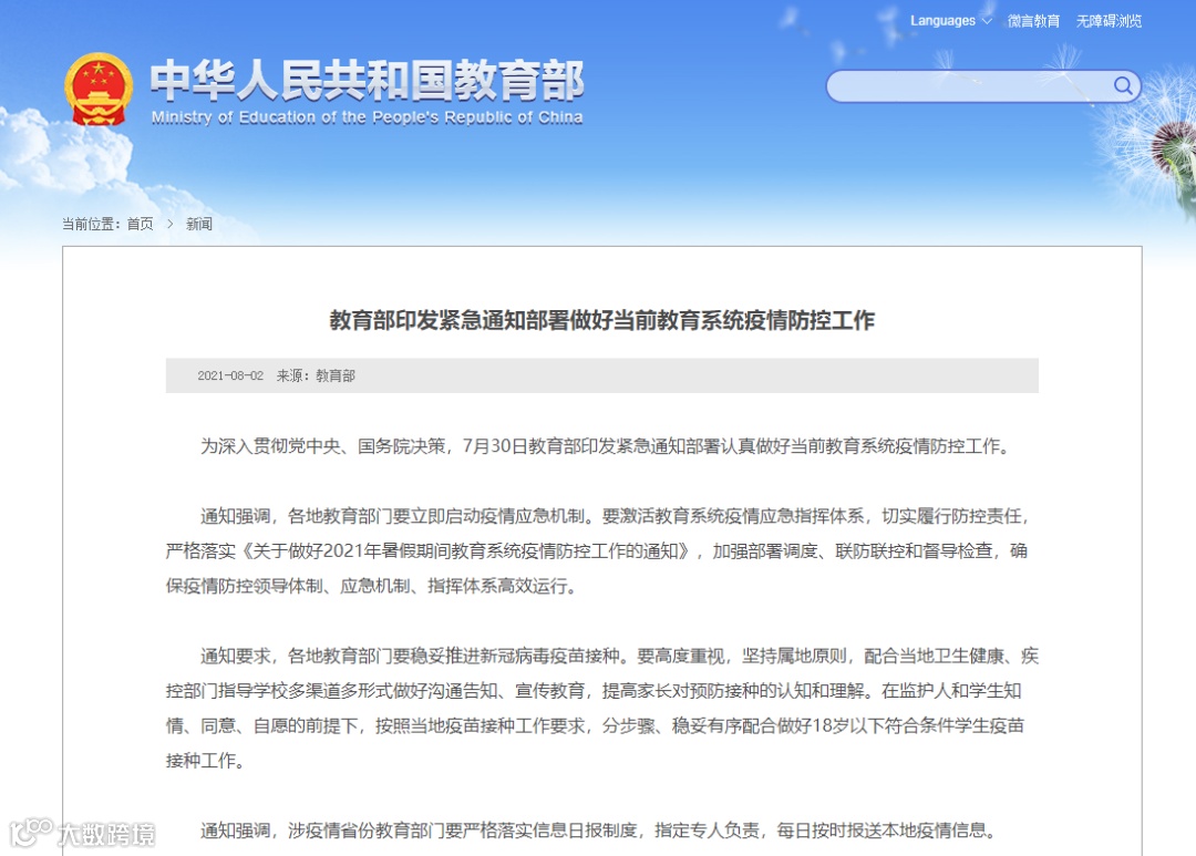 通知强调,各地教育部门要立即启动疫情应急机制。要激活教育系统疫情应急指挥体系,切实履行防控责任,严格落实《关于做好2021年暑假期间教育系统疫情防控工作的通知》,加强部署调度、联防联控和督导检查,确保疫情防控领导体制、应急机制、指挥体系高效运行。