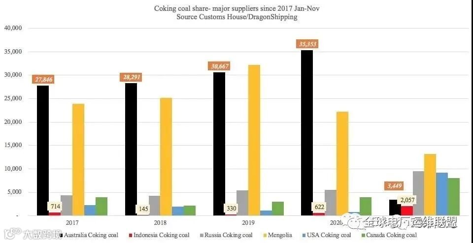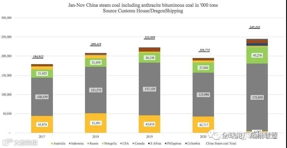 分煤种分析,印尼对华出口主要是动力煤、褐煤。由于澳大利亚煤炭受阻,我国加大了印尼动力煤进口力度,前11个月共计从印尼进口动力煤(含无烟、褐煤、其它烟煤及其它煤)1.7596亿吨,占全国进口总量(2.45232亿吨)的72%。与去年同期比,增幅54%。