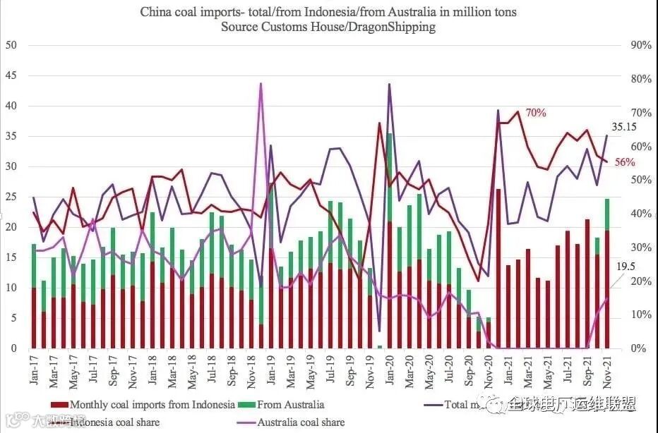 按月度计,印尼目前煤炭占中国进口份额的55-65%之间,而同期澳大利亚则降为‘0’。