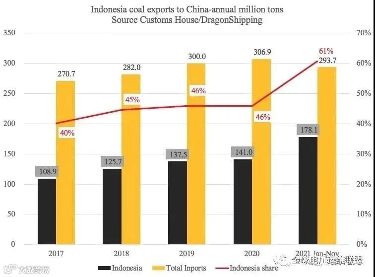中国1-11月份共计进口煤炭(无烟、焦煤、褐煤、动力煤)2.937亿吨,而印尼则对华供应1.781亿吨,月均对华出口1480万吨,份额由2020年的46%迅速上升为61%。叠加澳洲煤炭的困境,印尼该禁令将对中国煤炭供应产生重大影响。