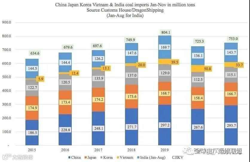 中日韩越印度五国煤炭进口占世界总煤炭海运量的65%以上,2021年前11个月(印度为各年1-8月份),共计进口煤炭7.53亿吨。