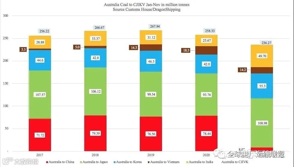 (澳大利亚对中日韩越印五国煤炭出口 1-11月份)