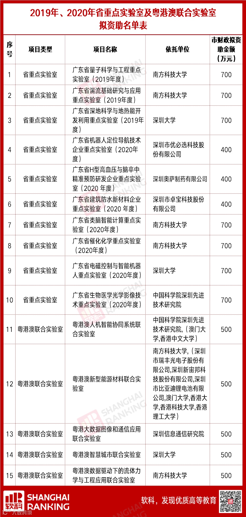 6月28日,深圳市科技创新委员会发布《深圳市科技创新委员会关于2019年、2020年省重点实验室及粤港澳联合实验室拟资助项目的公示》。公示称,深圳市科技创新委员会拟对2019年、2020年省重点实验室及粤港澳联合实验室项目进行资助,现予公示,向社会征求意见。