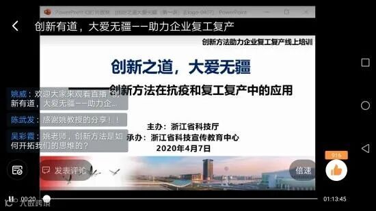 以《创新有道,大爱无疆——创新方法助力企业抗疫》为题,首场直播重点围绕“创新方法咋抗疫”“创新方法是个啥?”和“创新方法能干啥?”三方面展开。省重点企业研究院、高新技术企业等单位的近300名技术负责人或研发骨干聆听了讲座。在互动环节,学员还围绕“创新方法是如何开拓我们的思维的?”“创新方法TRIZ适合应用在哪些领域?”“如何运用创新方法TRIZ让产品设计得更好?”等话题展开热烈的讨论。