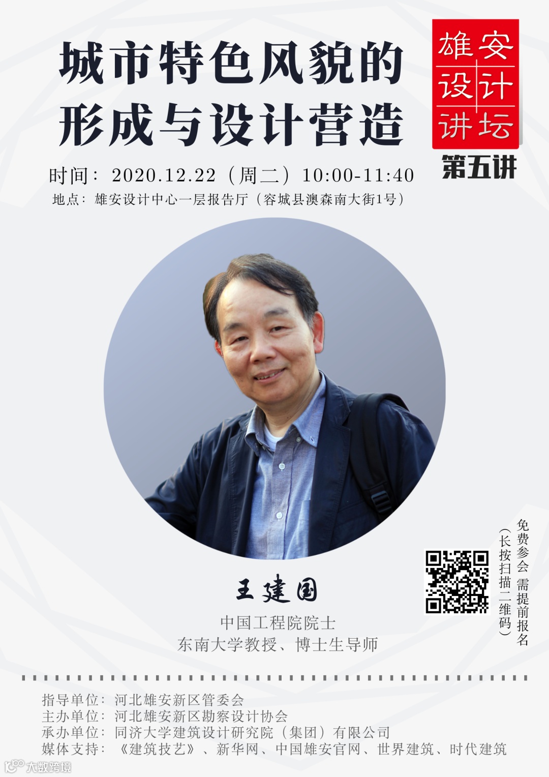 “雄安设计讲坛”作为河北雄安新区勘察设计协会的常态化交流活动,每月在雄安设计中心召开一次。前4讲于8月-11月召开,邀请单霁翔、张杰、陈同滨与周俭4位专家进行了精彩分享(登录网址https://4m.cn/kO3Bx或点击文末“阅读原文”观看回放),获得广泛赞誉。本期精彩继续,邀请中国工程院院士,东南大学教授、博士生导师王建国主讲《城市特色风貌的形成与设计营造》,敬请期待!