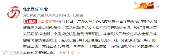 据@北京西城,6月14日,广外天陶红莲菜市场有一名往来新发地市场人员被确诊为新冠肺炎病例,其住丰台区花乡。西城区有关部门已于当日上午暂停广外天陶红莲菜市场对外服务,并进行环境监测评估和相关人员隔离观察。