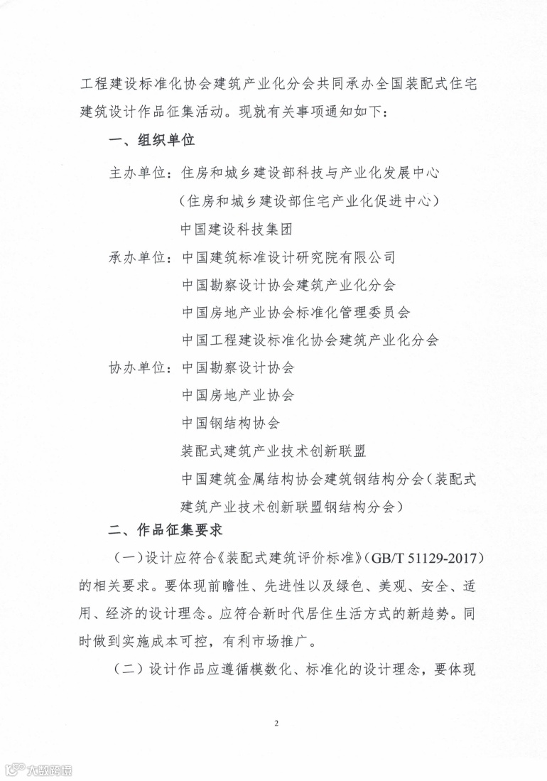 在住房和城乡建设部标准定额司支持下,住房和城乡建设部科技与产业化发展中心(住房和城乡建设部住宅产业化促进中心)、中国建设科技集团共同主办,中国建筑标准设计研究院有限公司、中国勘察设计协会建筑产业化分会、中国房地产业协会标准化管理委员会、中国工程建设标准化协会建筑产业化分会共同承办全国装配式住宅建筑设计作品征集活动。