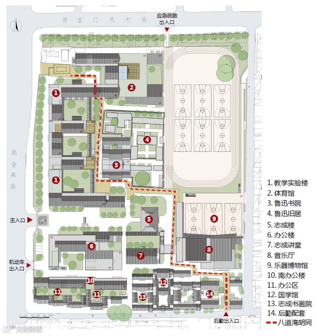 从八道湾胡同的东南端到西北端,两侧依次分布着后蓟院落、国学馆、金帆音乐厅、志成楼、鲁迅旧居、图书馆(鲁迅书院)和教学楼,或传统,或现代,这些不同的建筑勾勒出了胡同的空间意向。