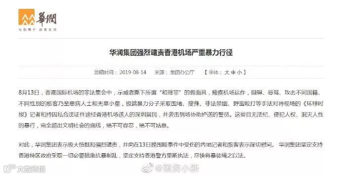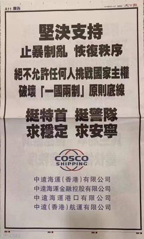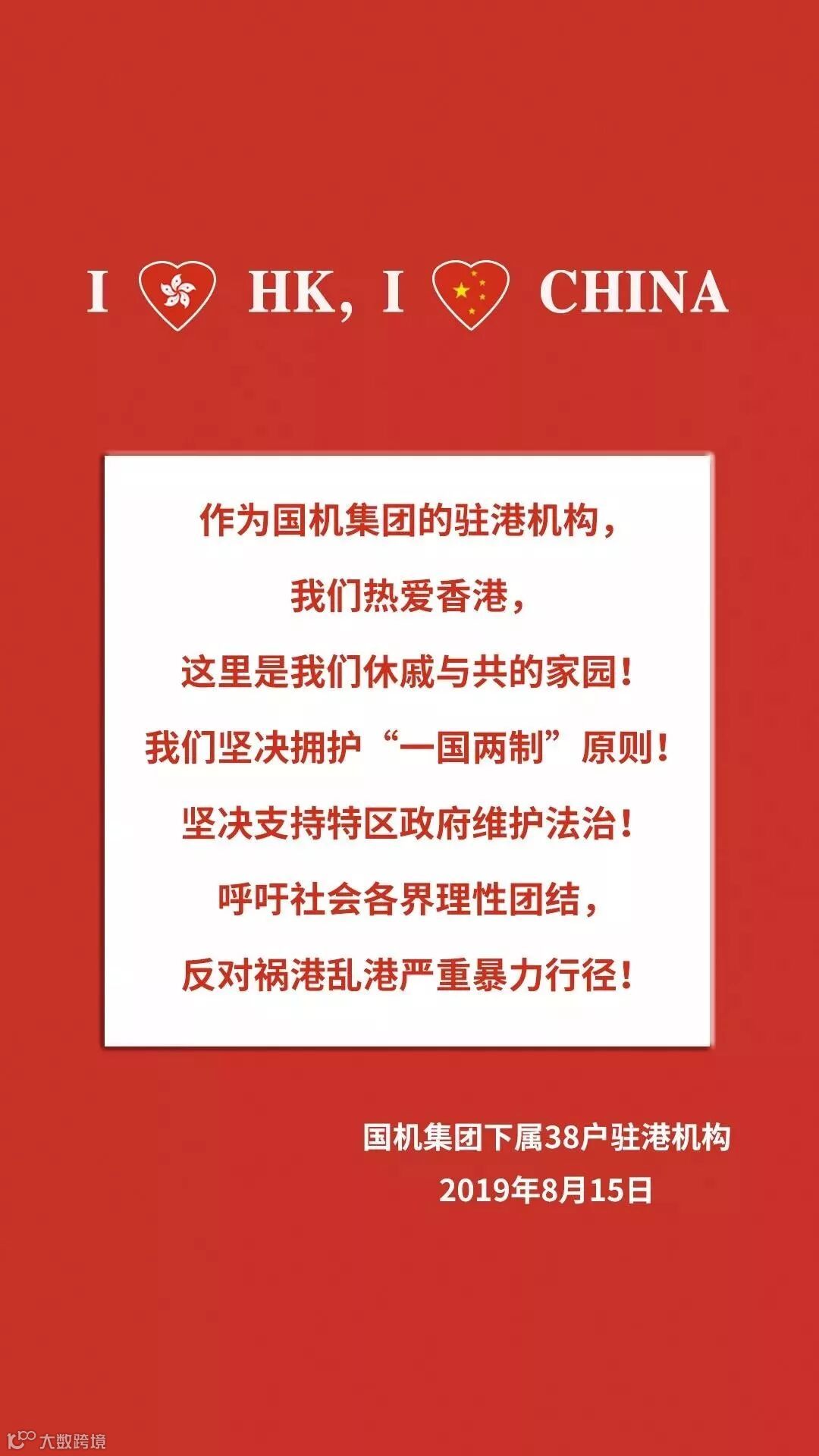 ▲招商局、华润集团、中国旅游集团、中国电信、国机集团、中远海运、中化集团等中央企业发声,反对祸港乱港,支持止暴制乱,呼吁恢复秩序。