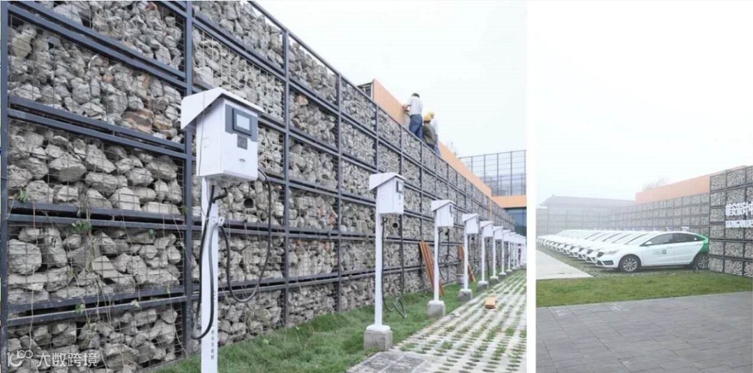 以石笼院墙和零碳馆外墙为界面,退让出共享汽车充电停车场,既解决了人车分流问题,又形成了友好的城市界面。