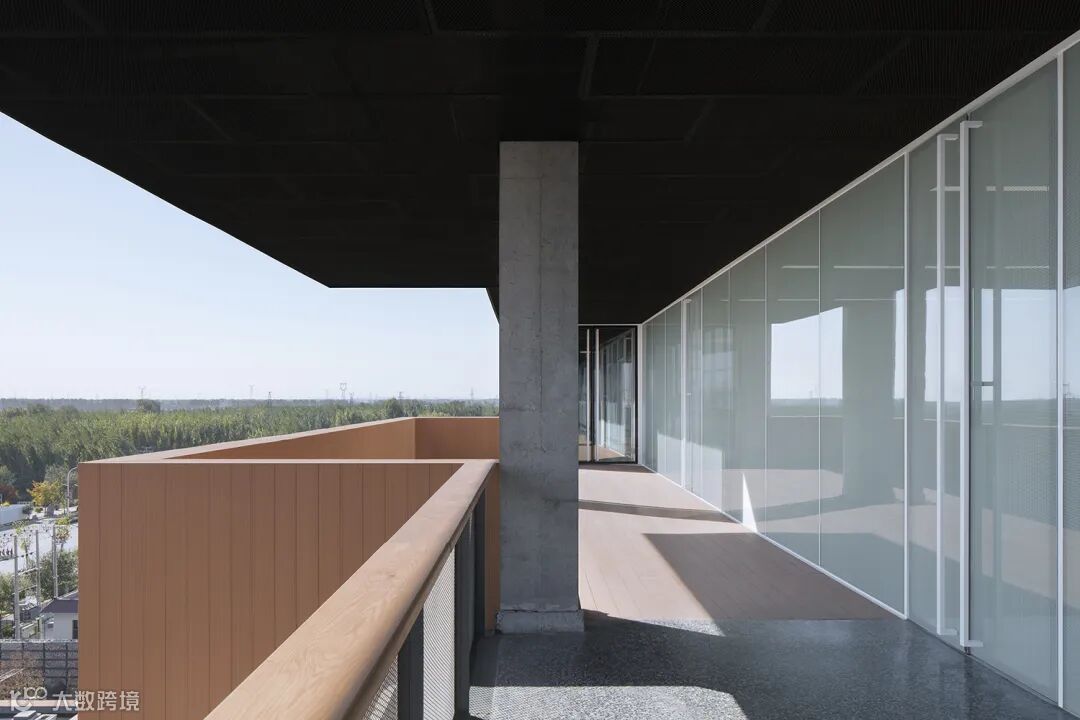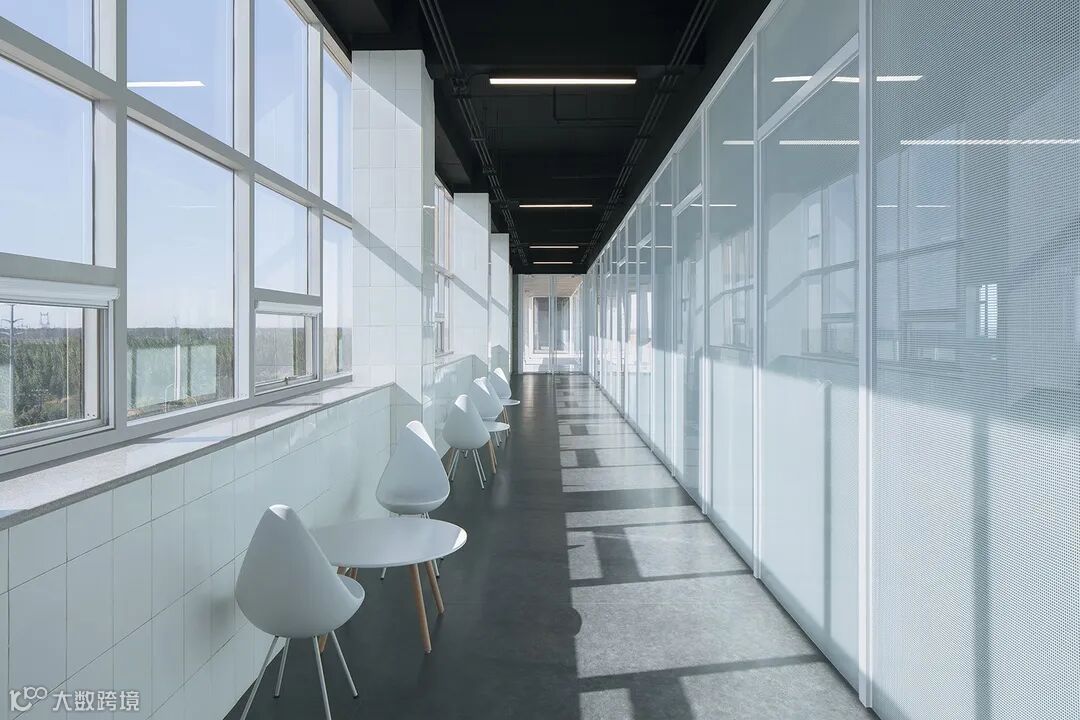 建筑师爸爸们在建筑南侧设计了半室外的通廊,既减少了南侧眩光对办公的影响,又相当于室内外传热的缓冲带。挑出阳台两侧各加入了一条阳光缓冲走廊,把不适合办公的眩光区域变成了一个公共走廊。这个走廊形成了一个风廊,远处的门是可以打开的,穿堂风使得该区域变得很凉爽;而冬天把门关闭,这条走廊就变成了阳光暖廊,冬季几乎不使用空调取暖就可实现18℃的室温,大幅减少了用能空间和时段。
