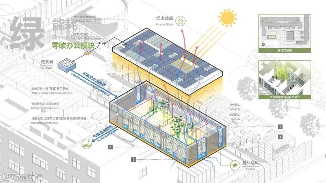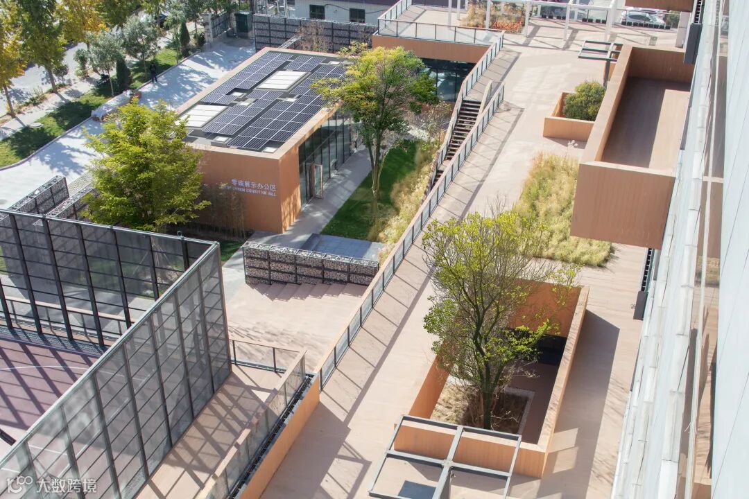 这里全面应用自然通风系统和高性能外墙的创新,充分利用可再生能源,建筑师爸爸们创造了一个零碳展示与零碳示范空间。绿色循环系统形成了光—电—水—绿—气的能源循环自平衡。