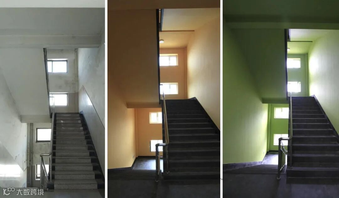 楼梯间原有的墙面受潮剥落,现在涂上了会呼吸的矿物质无机涂料。