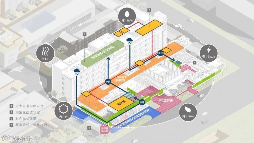 建筑师爸爸们利用景观充分进行雨水利用与海绵调蓄,屋顶打造温室农业,实现鱼肥共生。