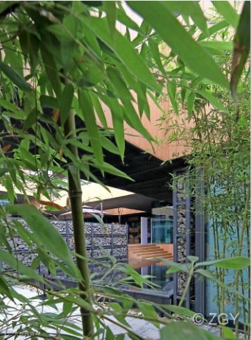从主入口进来,沿着小径可以穿进很多小的院落,坐到里面就像坐进四合院里,上面有遮风避雨的连廊,中间可以透过阳光甚至飘下树叶,晴天时可以沐浴清爽的微风,下雨时可以躲在廊下听风观雨,别有一番情趣。这是中国文化和古典园林文化对心灵的触动。