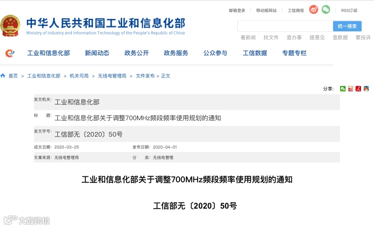 4月1日,工信部官网发布《关于调整700MHz频段频率使用规划的通知》,为我国低频段5G发展提供频率保障。