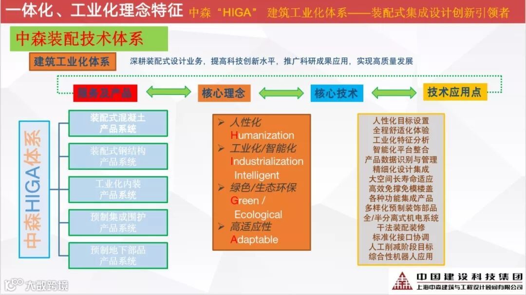 中森“HIGA”建筑工业化体系的核心理念,是“人性化、工业化/智能化、绿色/生态环保、高适应性”,当前智能化实施路径及问题主要包括:“源头设计理念转变还较慢,标准化、模块化、成品元素组合的观念深入实施还不够面对工业化生产、总装的结构设计理论还很滞后,整体性能、抗震、连接、耗能等需要跨界学习,现浇连接不是长久之计BIM全过程实施思想均有思考,对于实践落实有较大提升,但部分复杂应用还不成熟、效率较低,还不能实现完全的独立软件解决方案与工业生产系统、智能物流及智慧工地的系统接口不够统一完整,还需实践完善数据量巨大,运营效率和成本可能会成为不得不重点考虑的问题”
