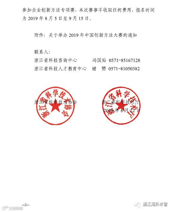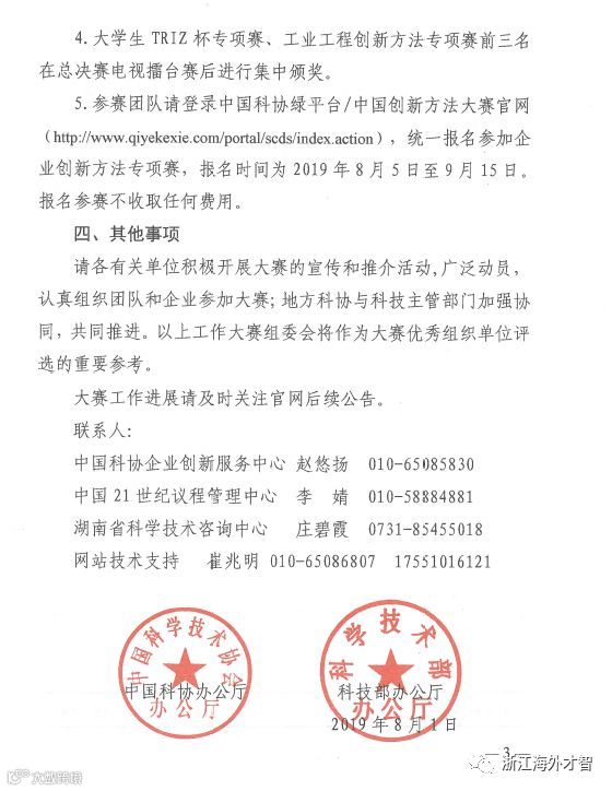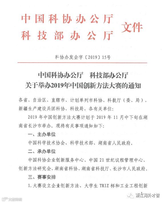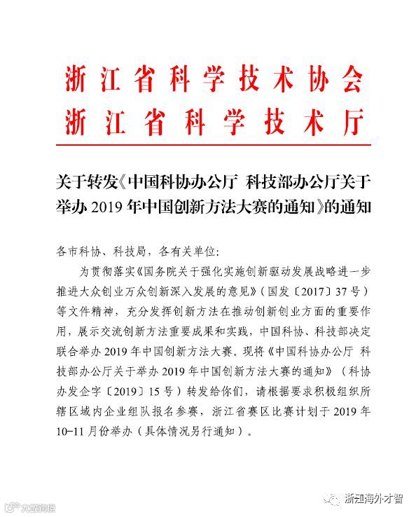 浙江省科学技术协会、浙江省科学技术厅关于转发《中国科协办公厅 科技部办公厅关于举办2019年中国创新方法大赛的通知》的通知: