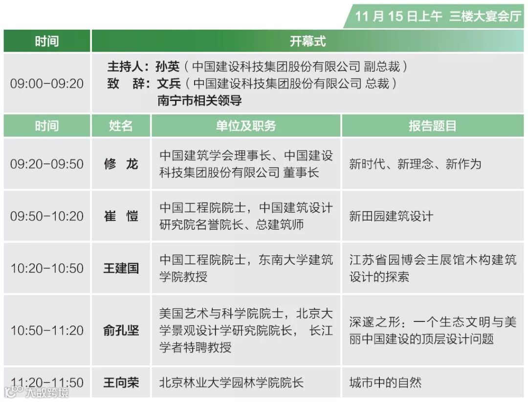在主旨论坛上,修龙董事长、崔愷院士和王建国院士、俞孔坚院士(美国)、王向荣院长将分别围绕“新时代、新理念、新作为”、“新田园建筑设计”、“江苏省园博会主展馆木构建筑设计的探索”、“深邃之形:一个生态文明与美丽中国建设的顶层设计问题”、“城市中的自然”等主题做主旨演讲,文兵总裁及南宁市相关领导将在开幕上致辞,孙英副总裁主持会议。