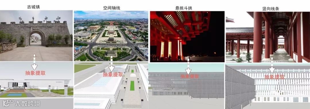 在中国古代传统元素的抽象表达上,体育中心对古城墙、空间轴线、悬挑斗拱等进行抽象演绎。