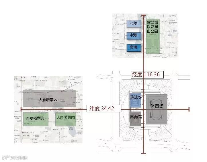 场地在东经116.36度处与紫禁城以及景山公园相重合,在北纬34.42度处与西安大雁塔景区、植物园、大唐芙蓉园相重合。