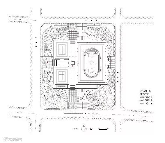 从总平面图布局上(如图1),利用水系环绕主体建筑一周将建筑与场地隔离开来,再设置广场和阶梯进入场馆内的平台系统实现建筑与道路的联系。另外剩余的场地边角分别设置绿化和停车场,形成了建筑与绿色景观交相辉映的城市美景。