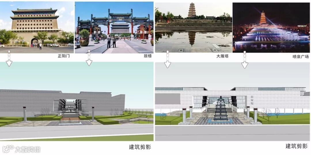 西广场门前雕塑源自于大雁塔的抽象简化,周边的水体景观来自于雁塔广场前的喷泉广场简化,入口序列空间源自于雁塔广场前的轴线关系,充分体现了体育中心对传统历史遗迹的继承。