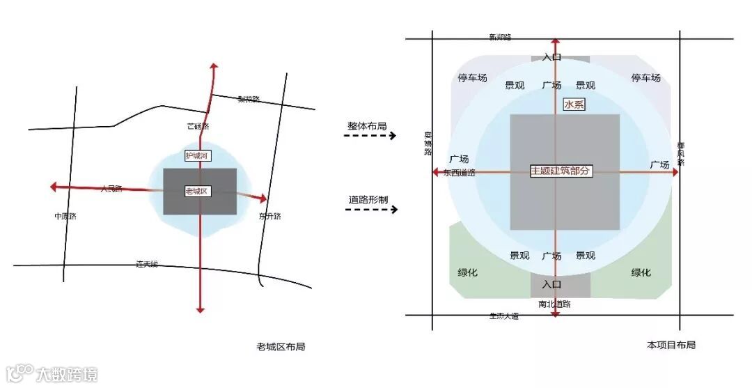 建筑主体部分与周围的景观呈现方与圆的形式对比,形成一种层层推进,群星拱月的构图形态。与中国汉族传统文化中的“天圆地方”学说相契合,周边水系就像是一个圆周永无休止的运动,周而复始,无始无终,而中间的主体建筑恰如一个方形的物体静止稳定的承载着我们,以此寄托出人们的追求和希望。