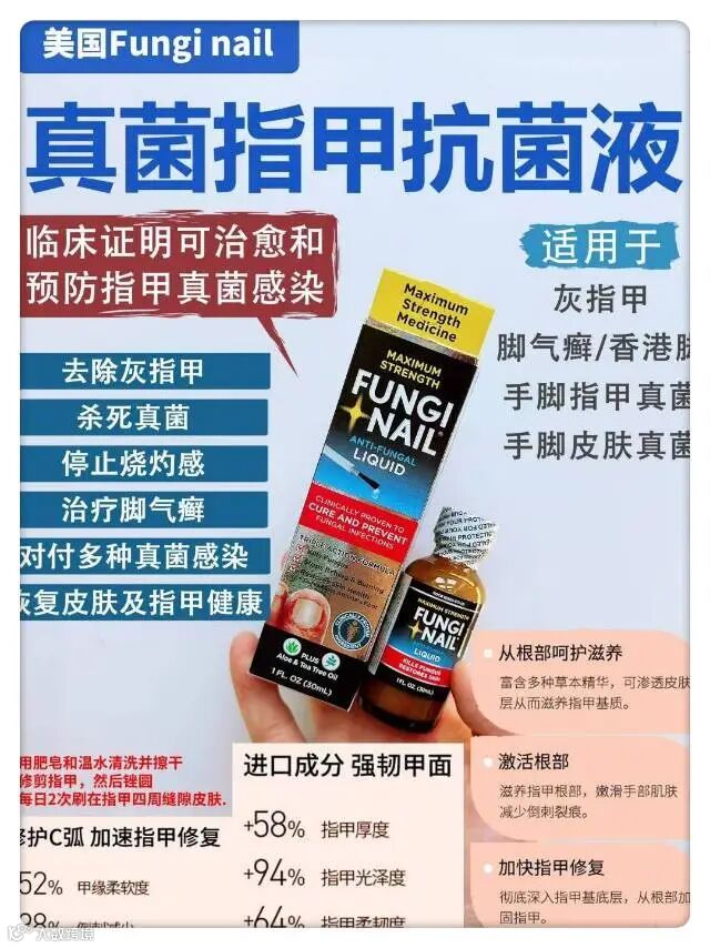 无毒无害!不仅是脚气,还有手指脚趾灰指甲等多种真菌感染的疾病!特别见效!在美国已销售超过25年时间,是美国医生常推荐品牌。无色、无味的透明液体,容易渗透,可以有效杀灭真菌,缓解干裂、痒痕、脱皮状况。