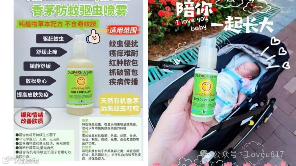 婴儿宝宝放心使用的一款高端驱蚊水。天然防蚊驱虫喷雾的原理是利用对人体绝对安全无害的纯植物精油的香味驱赶蚊虫。含香茅、柠檬草和雪松精华等纯植物草本配方,加州宝宝驱蚊喷雾,市面上的防蚊驱虫喷雾的原理大多是把蚊虫驱赶开一般都会含化学剂和杀虫成分,包括驱蚊手环,也是含有避蚊胺,成人对这些成分不一定会有不良反应,但是娇嫩的宝宝就很难抵挡,加州宝宝驱蚊液完全是利用蚊虫不喜欢的天然气味,气味温和,完全不含任何化学剂。