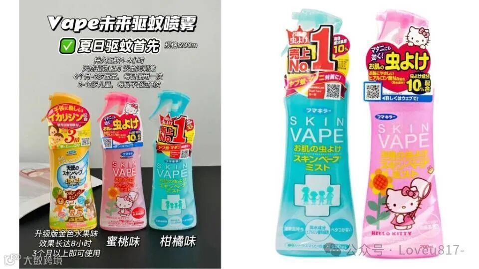 这款VAPE未来驱蚊喷雾专为宝妈、婴幼儿打造12周以下孕妇也可用哦!主要成分:避蚊胺 植物提取物成分安全不含有农药配方无色无毒又好闻不仅仅对蚊子有效;对其他的昆虫都有效果哦,不敏感无刺激,驱蚊的同时还可以滋润肌肤,外出游玩带一瓶长时防蚊避免叮咬。
