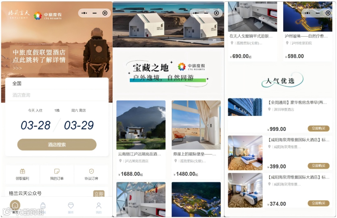 自2025年1月战略合作启动以来,格兰云天酒店集团首批6家精品酒店率先上线中旅度假数字化平台,覆盖北京、深圳两大一线城市,为中旅度假的会员和用户提供多元化的住宿选择。3月28日新增的5家中旅度假酒店,则进一步丰富了格兰云天平台的度假产品矩阵,其中青海孤独星际酒店作为中旅度假即将开业的旗舰项目,在格兰云天平台同步上线预售产品,成为此次合作的亮点。