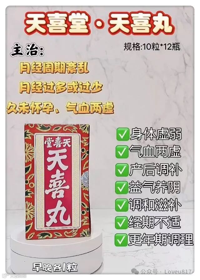 香港百年老字号,始创于1905年天喜堂创办人林肇春医师基于家传秘方加上多年诊症的经验,发展出响誉全国的《天喜丸》(原称为天喜堂调经丸)美容保健气血调理,长期服用亦无副作用。现代社会工作繁忙,日常生活压力太大,女性常服天喜丸,可保身心健康。