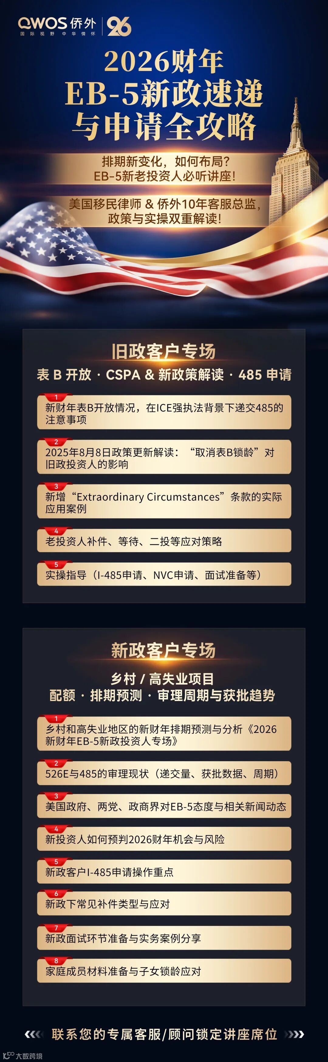 随着2026财年的脚步渐近,EB-5新政也迎来了新的变化与挑战,排期问题更是牵动着每一位投资人的心。为了帮助大家精准把握新财年EB-5动态,科学布局移民之路,侨外集团特别举办“2026财年EB-5新政速递与申请全攻略”讲座活动,诚邀您的参与!