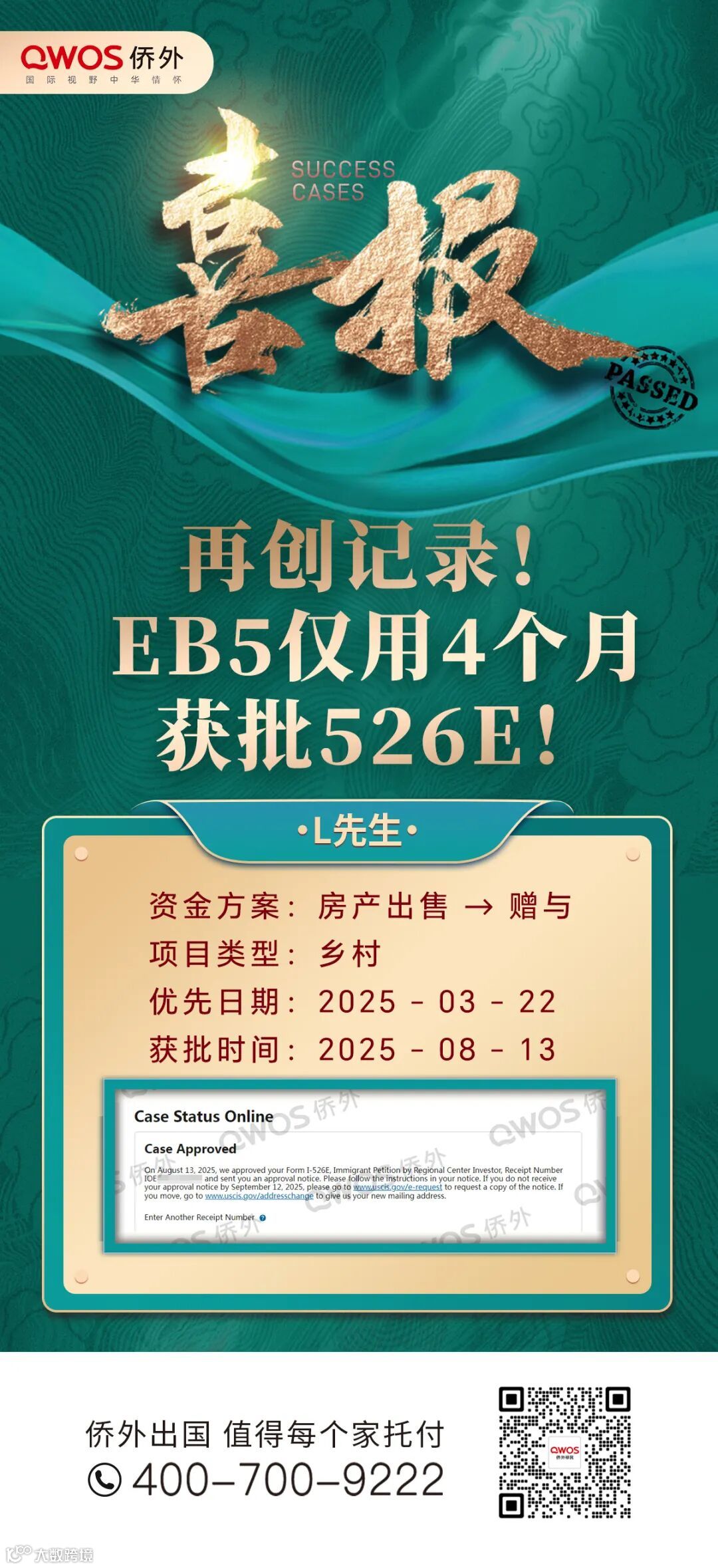 侨外VIP专属服务团队以及实力强劲的文案团队,帮您快速上车,助您2-3个月光速拿下“小绿卡”,快至4个月便能成功获批I-526E——