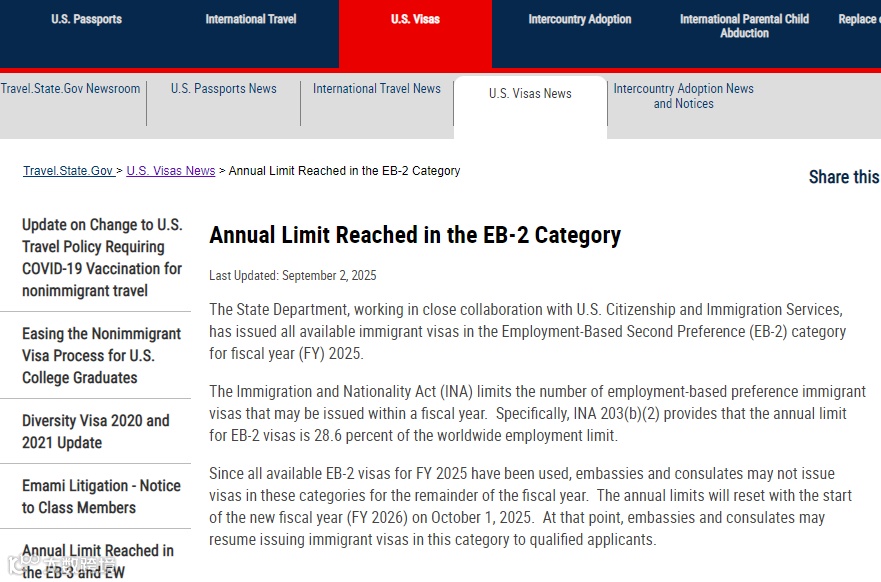 当地时间9月2日,美国国务院签证办公室宣布,2025财年职业移民第二优先EB-2类别的所有签证配额已全部用尽。
